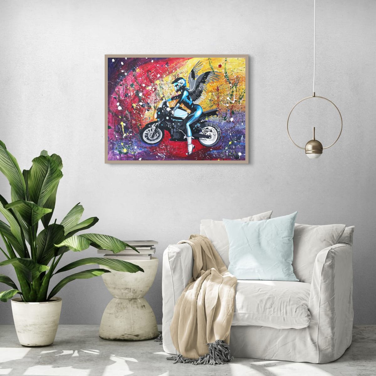 The composition captures a moment of suspended motion: a guardian‑like presence, part angel, part rider, part myth. The wings suggest freedom and transcendence, while the dark palette evokes mystery, inner conflict, and transformation. This contrast between light and shadow gives the portrait its emotional depth and contemporary edge.