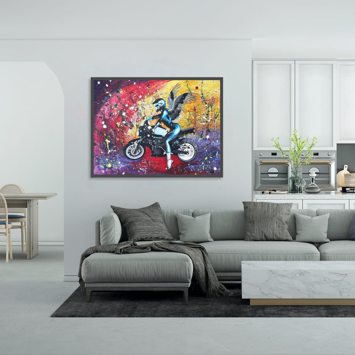 The composition captures a moment of suspended motion: a guardian‑like presence, part angel, part rider, part myth. The wings suggest freedom and transcendence, while the dark palette evokes mystery, inner conflict, and transformation. This contrast between light and shadow gives the portrait its emotional depth and contemporary edge.