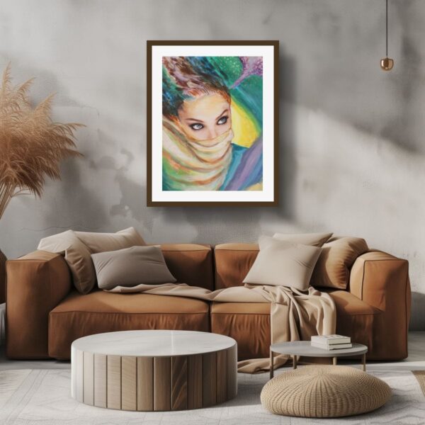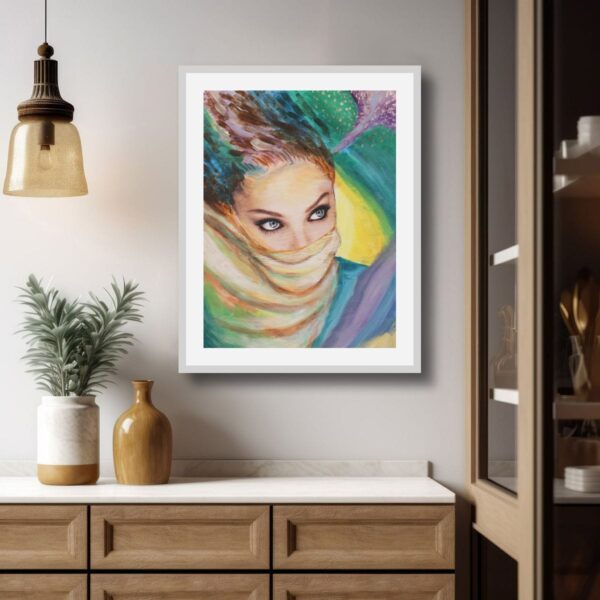 This captivating portrait presents a figure shrouded in mystery, her striking eyes piercing through a delicate veil. The interplay of vibrant colors creates a dynamic backdrop, enhancing the sense of intrigue. The flowing brushwork evokes movement, suggesting a story waiting to unfold. This artwork embodies a blend of elegance and enigma, making it a compelling addition to any space, inviting contemplation and conversation. Created 2020