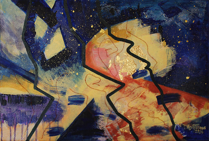 “Little Night Music” is a luminous abstract painting inspired by the flowing elegance of Mozart’s serenade. Created with acrylics, soft pastels, and shimmering gold leaf, the piece blends gentle movement with inner radiance. Cool and warm tones meet in a dynamic composition that evokes both harmony and quiet emotional depth.