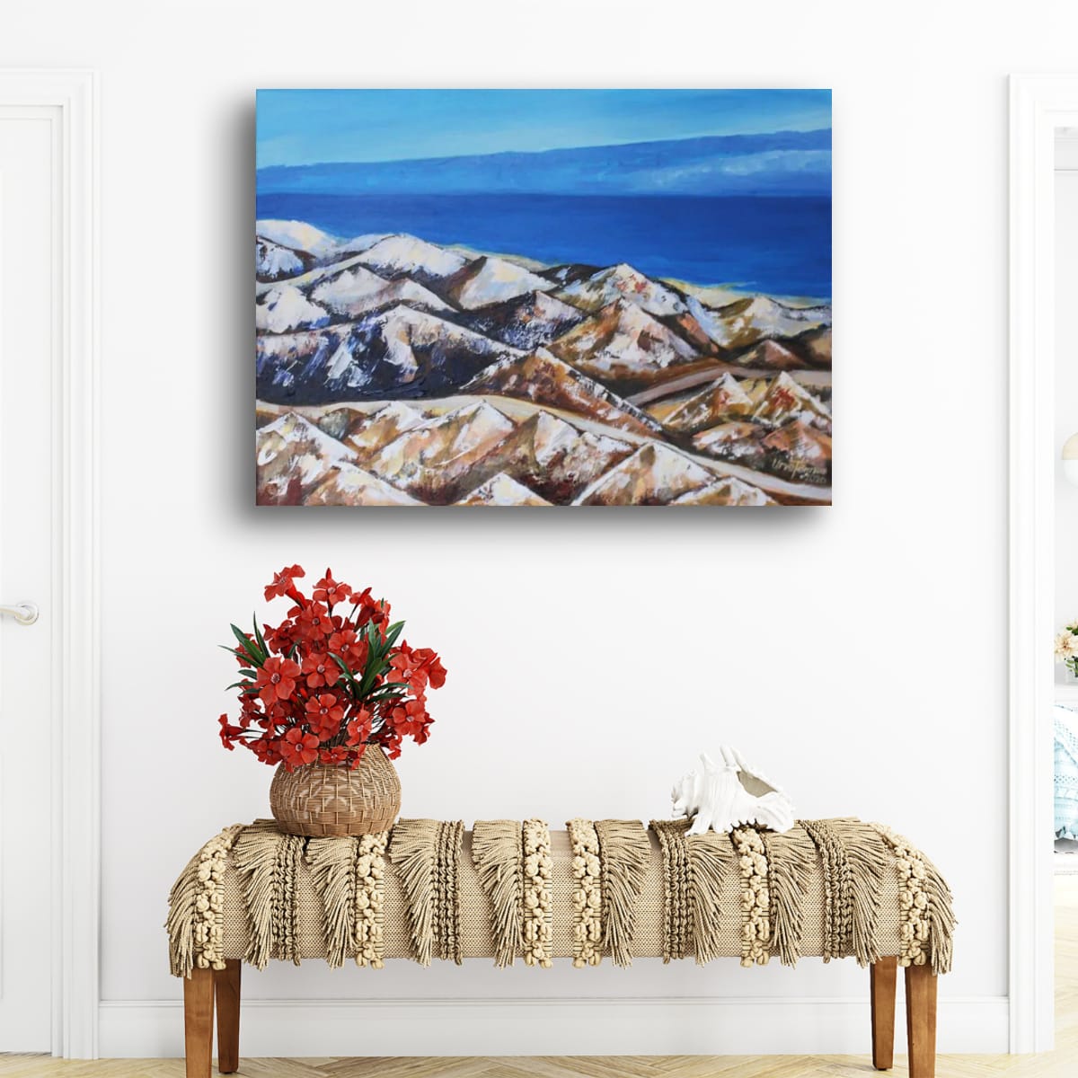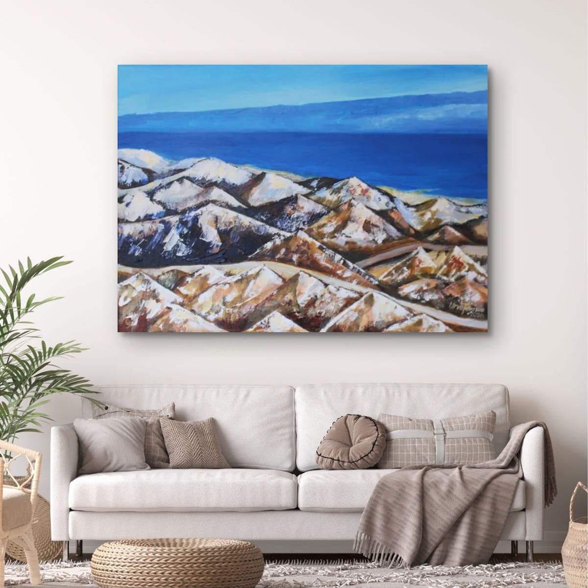 Step into a world of timeless landscapes and boundless horizons with “On the Way to Egypt.” This original acrylic painting captures the rugged beauty of mountain ranges meeting the deep blue expanse of sky and water. Each expressive brushstroke invites you to embark on a journey—one filled with adventure, reflection, and the quiet power of nature.