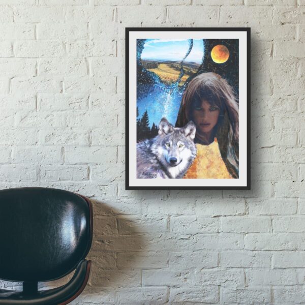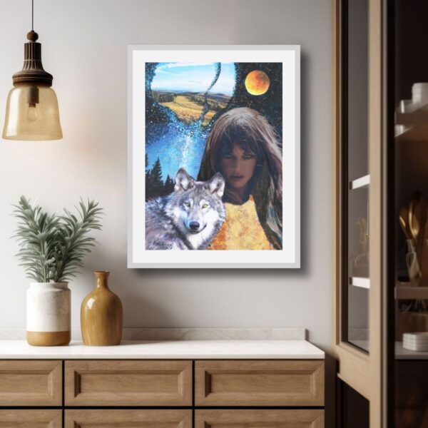 A mystical collage inspired by Clarissa Pinkola Estés’s book Women Who Run with the Wolves. This original artwork captures the deep bond between a woman and a wolf in a moonlit landscape, evoking themes of wild instinct, feminine strength, and spiritual freedom.